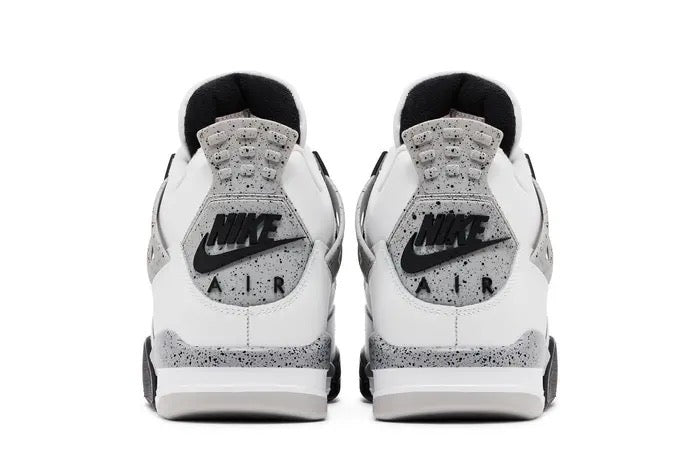 The 2025 version of the Air Jordan 4 Retro OG 'White Cement' carries a layered white leather upper tooled with the signature quarter panel netting and black molded eyelets. The support wings are painted in grey, decorated with black speckles, matching the Air-assisted foam midsole, and Nike-branded heel tab. The red Jumpman logo matches the Flight-branded tongue tag. The rubber outsole has key flex grooves for a comfortable sensation and a herringbone pattern for smooth traction.