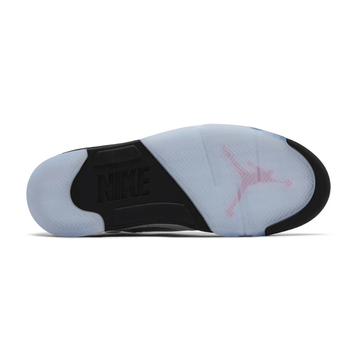 The Air Jordan 5 Retro 'Medium Soft Pink' rolls out a black foam midsole accented with pink sharktooth details and equipped with a Air-sole heel unit. The white leather upper is complemented with a see-through side panel netting and a pink embroidered '23' on the heel. More pink pops decorate the collar lining, Jumpman logo on the tongue and the Nike Air heel logo.