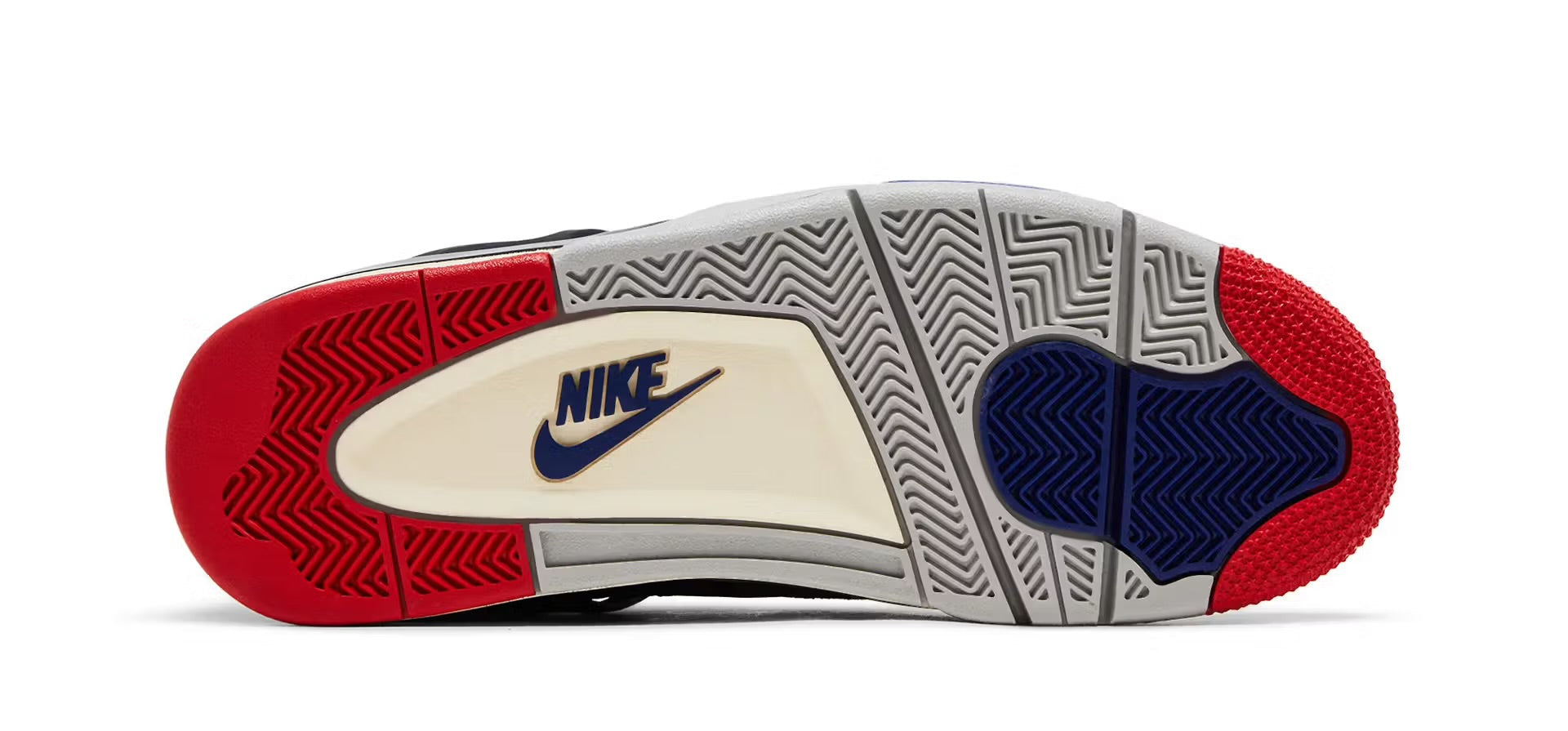 The Air Jordan 4 Retro 'Rare Air - White Lettering' dons a black nubuck upper with quarter panel netting, plastic support wings and red-and-black molded eyelets. A grey suede overlay bolsters the forefoot, piped in contrast white stitches. The collar is lined in a blue knit, matching a Nike Air-branded heel tab. Interchangeable Velcro patches adorn the tongue, while a 'Rare Air' logo decorates the insoles. A visible Nike Air unit in the foam midsole is done up in royal blue with a splash of black around the heel.